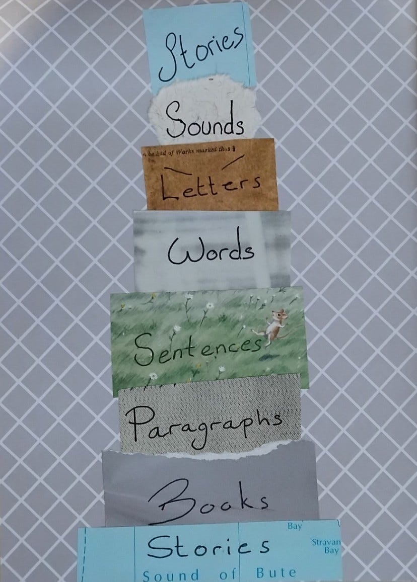 I suppose what was going through my head was how stories come together when we writers set to work, or rather, how they should come together. You start with a story in your head. We can turn sounds into letters to make words, to make sentences, and paragraphs which form books which should tell our story. Okay, I should have stuck chapters in there too, but I was chilled out, playing with scissors and PVA glue on a table covered in scraps of paper. If it makes you happy, just imagine chapters are there in some sort of parallel universe or something.
